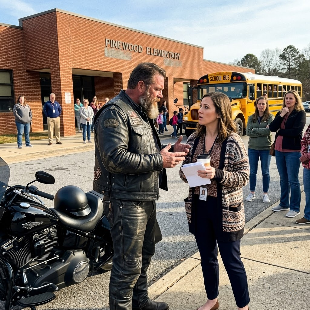 Parents started complaining. They whispered in the carpool lane, pulling their children a little closer when they walked past the towering biker. Some suggested he was a stalker. Others assumed he was trying to intimidate the school over a grudge. The tension grew so thick that the school principal, Mr. Davis, decided he couldn’t ignore the complaints any longer.