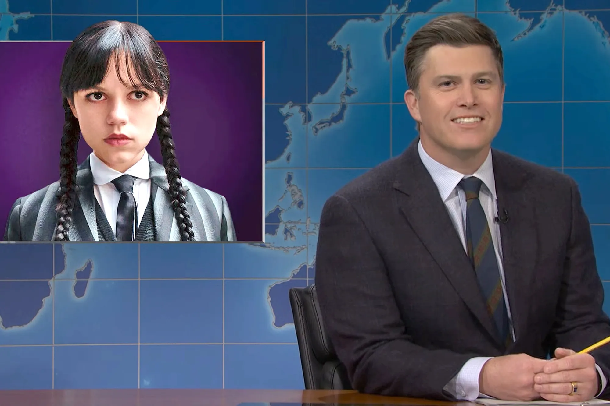 Jenna Ortega as Wednesday Addams; Colin Jost on ‘Weekend Update’ for ‘SNL’.Saturday Night Live/YouTube