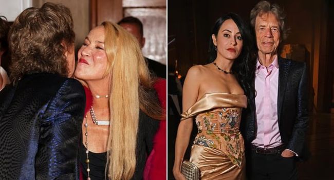 Cameras caught the warm moment Mick and Jerry greeted each other with a friendly hug and kiss on the cheek — a classy reunion that spoke volumes about how time can turn even the most dramatic love stories into fond memories.