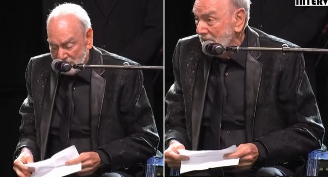 At center stage stood Neil Diamond — 84 years old, silver-haired, and still glowing under the soft blue light. In his hand was a folded piece of paper, edges frayed, corners yellowed by time.