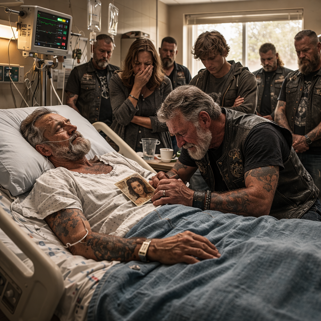 Razor, the outlaw biker, lay in the bed, his face pale and gaunt. Years of hard living had caught up with him, and now, as the end of his journey drew near, he seemed like a shadow of the man who once commanded respect with just a glance. His leathers were folded at the foot of the bed, a symbol of a life that had faded into a hospital gown and the beep of heart monitors.