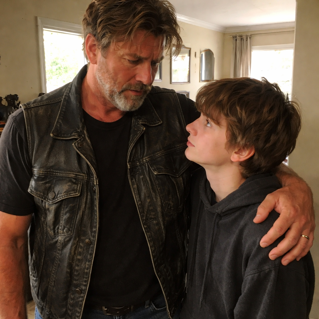 The house stood at the end of the street like a specter from his past. It was smaller than he remembered, the once-vibrant paint now faded and peeling, the garden overgrown. He pulled up to the curb, cutting the engine, but the silence that followed felt like a thousand pounds pressing down on his chest. This wasn’t just any stop on the road. This was where everything had started to go wrong. This was where his life had split into two roads, one leading to the life of a biker in the shadows, the other leading to a family that he had left behind.