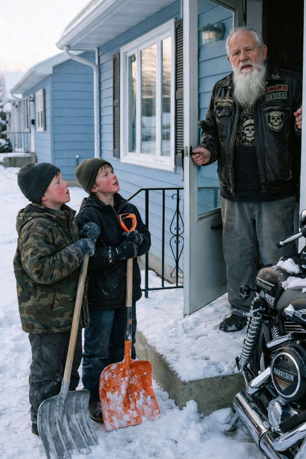 I stood there in my thermal shirt, faded denim, and arms covered in decades-old ink, staring at two boys who looked like they had been blown onto my porch by the storm. The older one was maybe fifteen. The younger one couldn’t have been more than twelve. They had two shovels between them. One was plastic and bent. The other had a handle held together with gray duct tape and a shoelace.