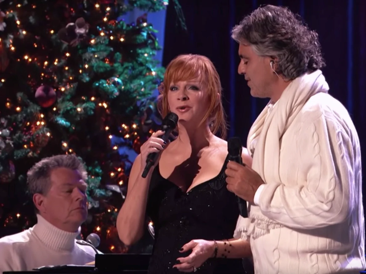 An Italian opera legend sharing a stage with a country music queen might sound like an unlikely pairing—but the moment they begin to sing together, any doubt disappears. Andrea Bocelli and Reba McEntire create something genuinely beautiful with their shared rendition of Elvis Presley’s classic “Blue Christmas.”
