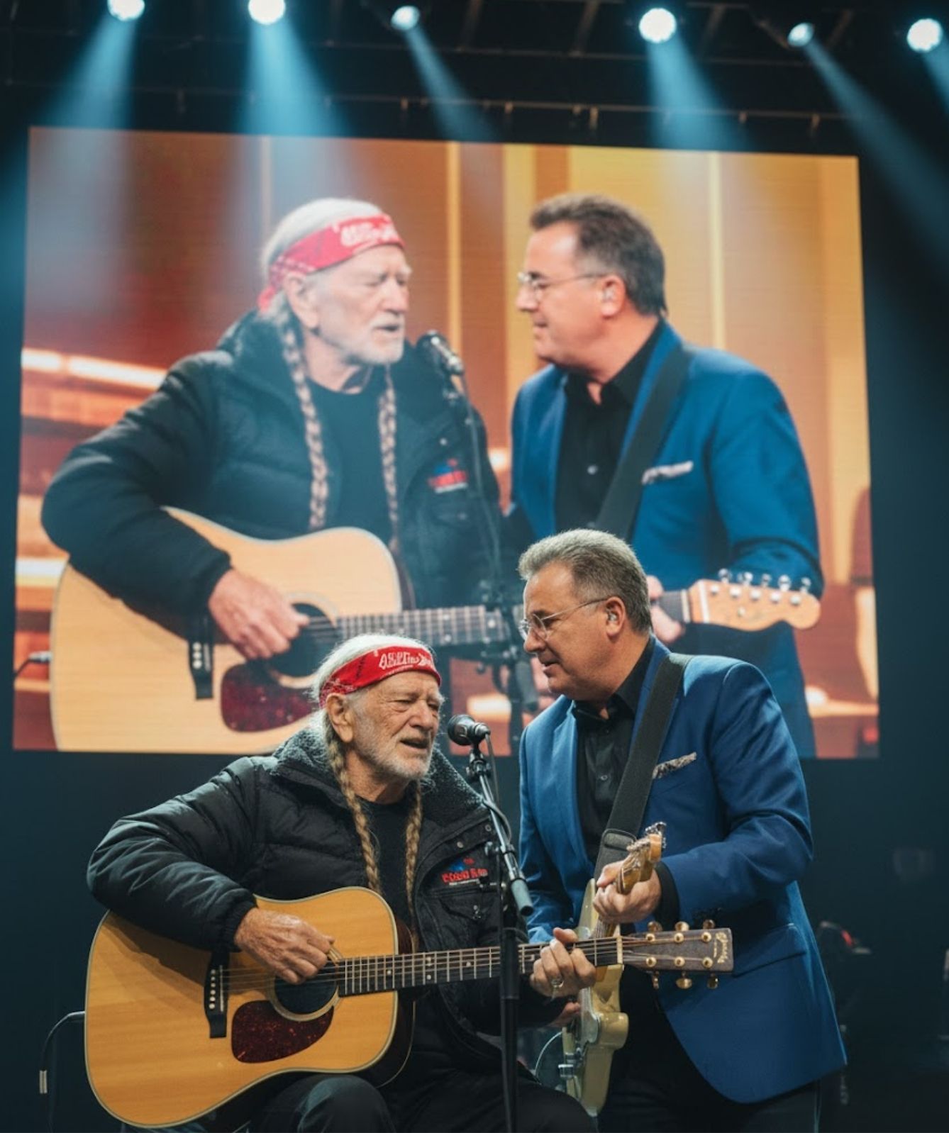 There was no orchestra behind them, no dramatic swell, no attempt to elevate the moment through volume or theatrics. Just two men standing still, carrying decades of songs, stories, and lived experience. Willie Nelson’s voice came first—worn, tender, unmistakably real. It didn’t reach for perfection or power. It rested gently in the space, like a truth long known and no longer in need of explanation.